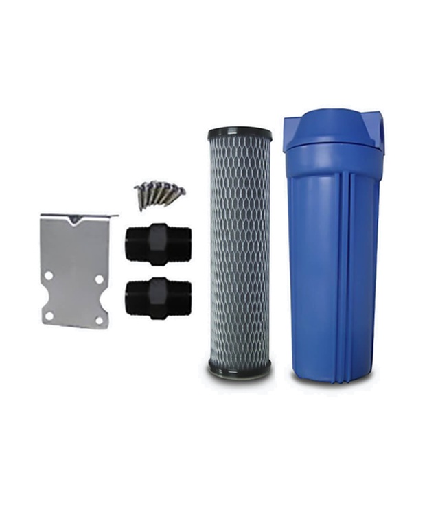The kit includes a robust 310mm filter housing, a 250mm granular activated carbon filter cartridge, and a stainless steel elbow water hose for reliable and easy installation.